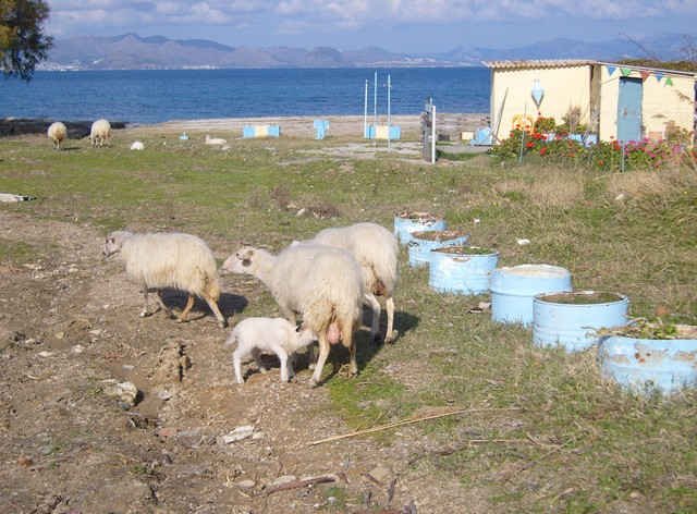 Sheep grazing on the beach, on the Island of Kos, Greece.