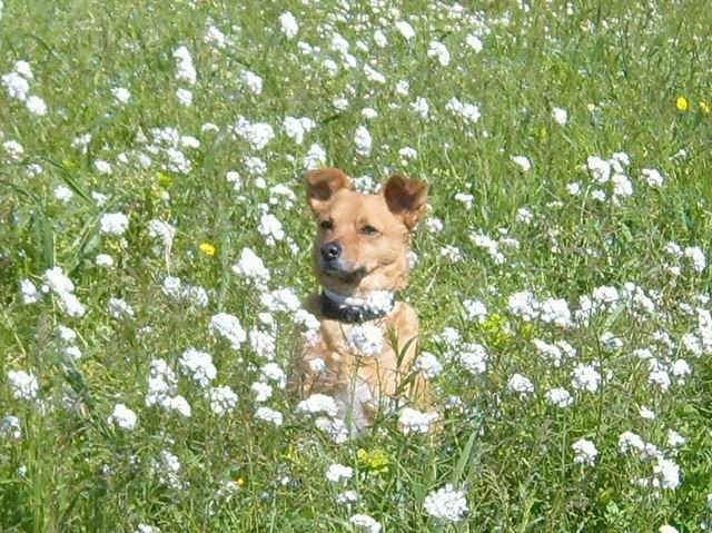 'Wasn't that a rabbit I just saw?' Juli in a field of flowers, near Carcassonne in France.